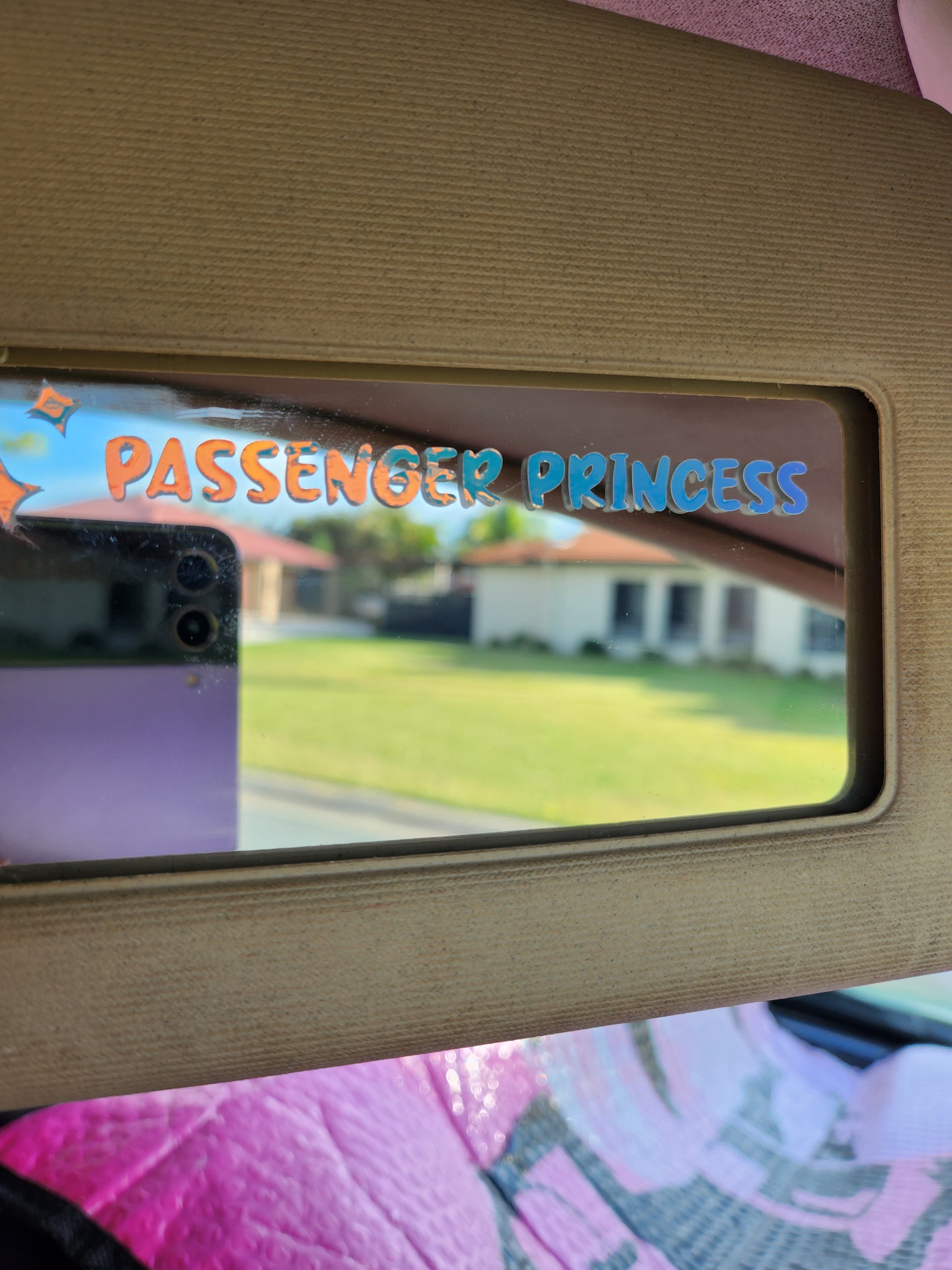 Experience the royal treatment with Passenger Princess, the perfect addition to any car mirror. This elegant and simple text will remind every passenger of their regal status. Upgrade your driving experience and make every journey fit for royalty.